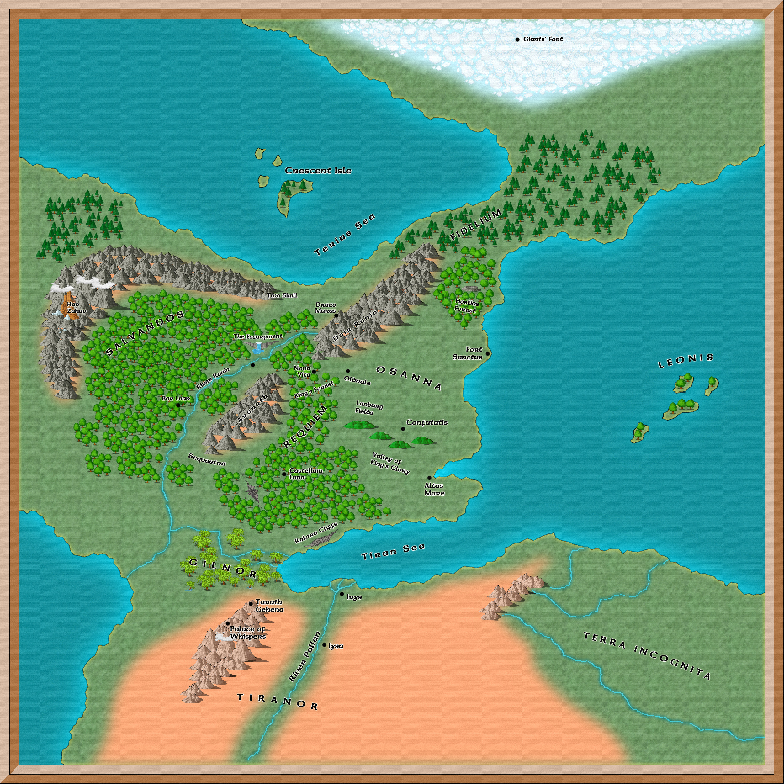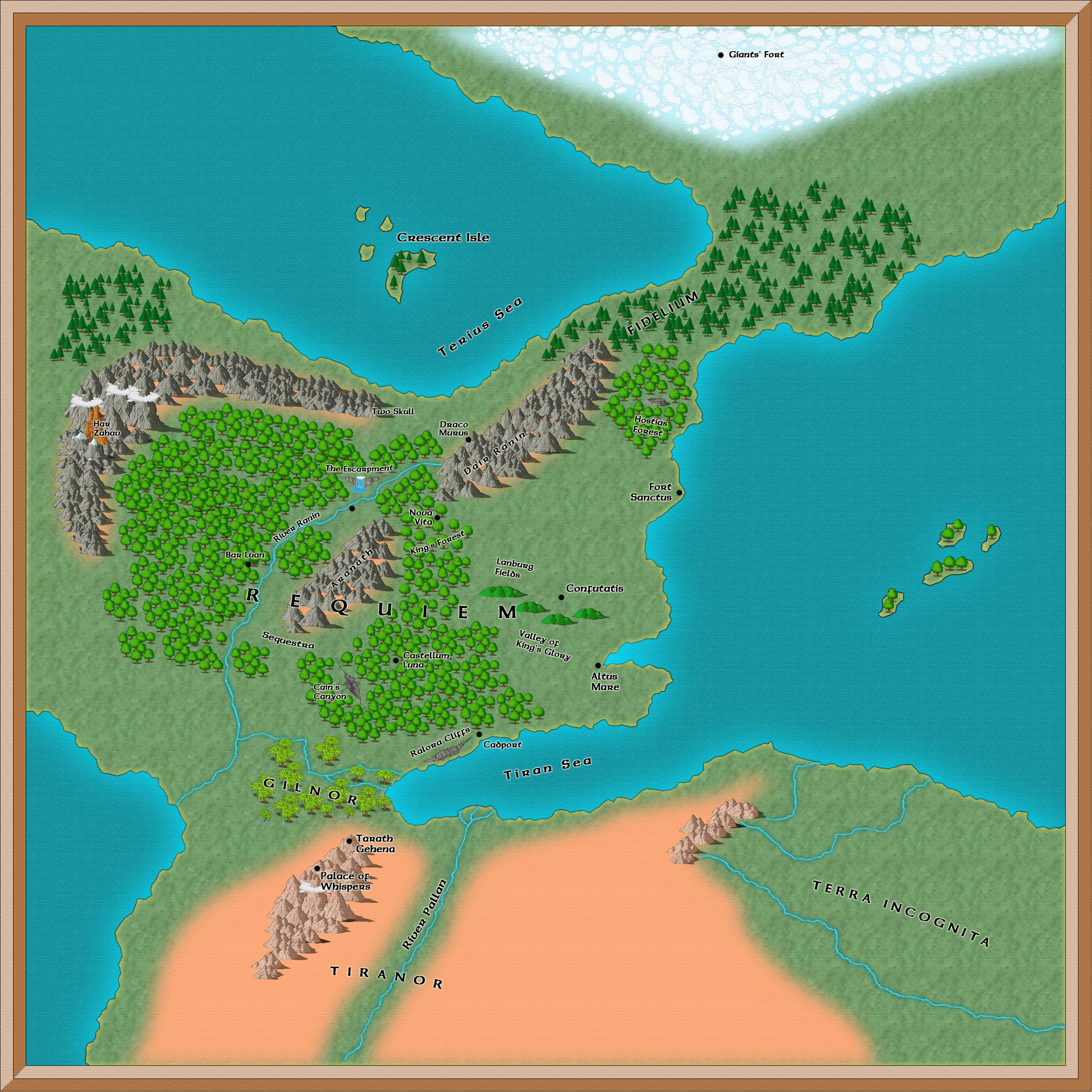 Here are maps of Requiem and its neighbors. As each Requiem trilogy is set in a different historical era, the map changes slightly between trilogies. Click each trilogy's thumbnail for its map.